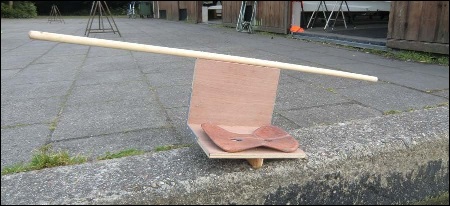 | To make: | There are two variants, one with and one without a stick. If desired, a seat can be mounted on the balance board, but this is not necessary. The base of the plank without stick is made of plywood with the dimensions 1,8x35x20cm. An aluminium L-profile of 4x4cm can be used for the tilting strip. Be sure the sharp end of this strip is in the middle of the board. Optionally, the center of gravity can be raised with a beam of 4.5x4.5 cm. In the latter case, the balance board has the balance characteristics of a single scull. The board with stick is suitable for instructional purposes. Both the horizontal and vertical surface are made of plywood with the dimensions: 1,8x33x28cm. Both surfaces are attached to each other with an angle iron. A piece of round wood (broomstick) is screwed onto the vertical plane. The tilt strip is 1cm high, no more. An L-profile of 1cm or a 1x1x33cm wooden beam, rounded on two sides, can be used for this. |