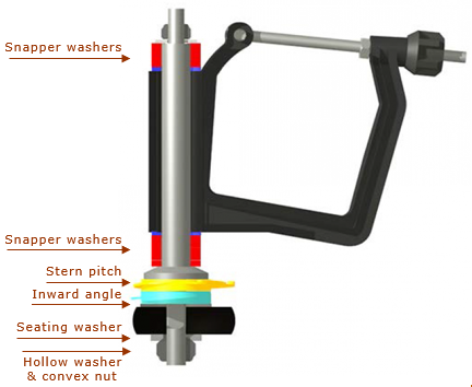 Not sustainable but cheap. This is therefore an attractive option, but it is important that the adjusting wedges used for the outward angle are marked. Otherwise, when loosening the oarlock not obvious which adjusting wedge belongs to which pitch/angle (forward or outward). It is also important to mount these adjusting wedges both above and below (in the opposite direction) and to clamp them between normal metal washers, so that they are not damaged when tightening the pin nut.