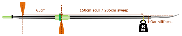 | Measure: | Use a tape measure in mm. Choose 65cm for the inboard distance and press the oar down on this point. Hang a weight of 10 kilos at the specified distance (150cm sculling, 205cm sweep rowing). Measure the oar displacement at the attachment point of the blade and determine the unloaded and loaded position. The difference between both positions is the oar stiffness: more millimeters means a slacker oar. | ||||